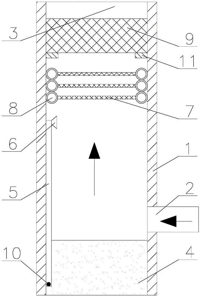 圖中:1、噴淋塔,2、進(jìn)氣通道,3、出氣口,4、儲水槽,5、水管,6、噴霧頭,7、除霧絲網(wǎng),8、冷凝管,9、炭箱,9-1、紗布,10、鐵球,11、限位塊。